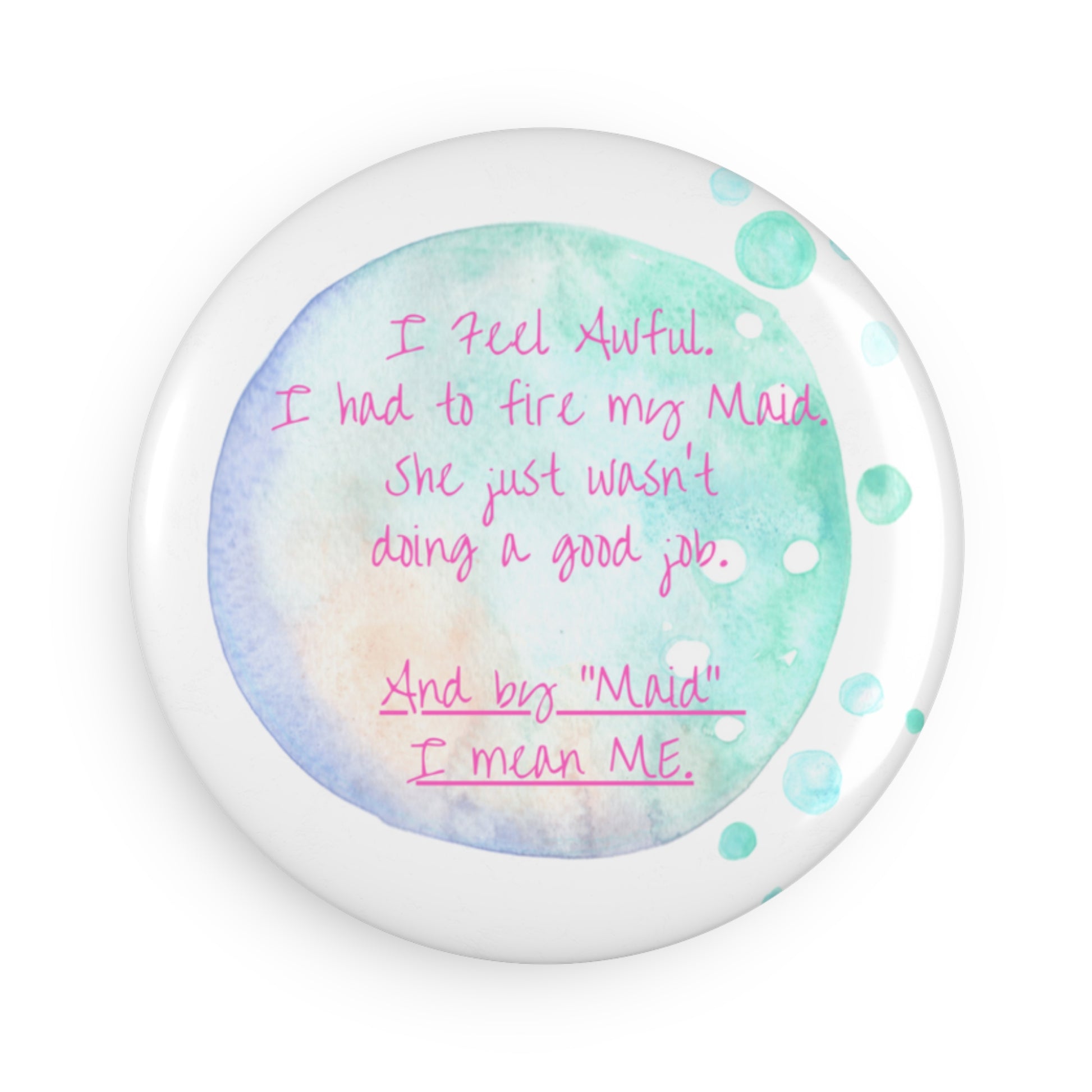 Add a touch of character on any metal surface with this hillarious magnet. This design is from our Southern Sass Collection & it states: "I Feel Awful. I had to Fire My Maid. She just wasn't doing a good job. And by Maid, I mean ME." This round magnet features a metal shell front with a magnetic backing. On the front, you'll find a clear mylar/UV cover that protects against fading and scratches.
